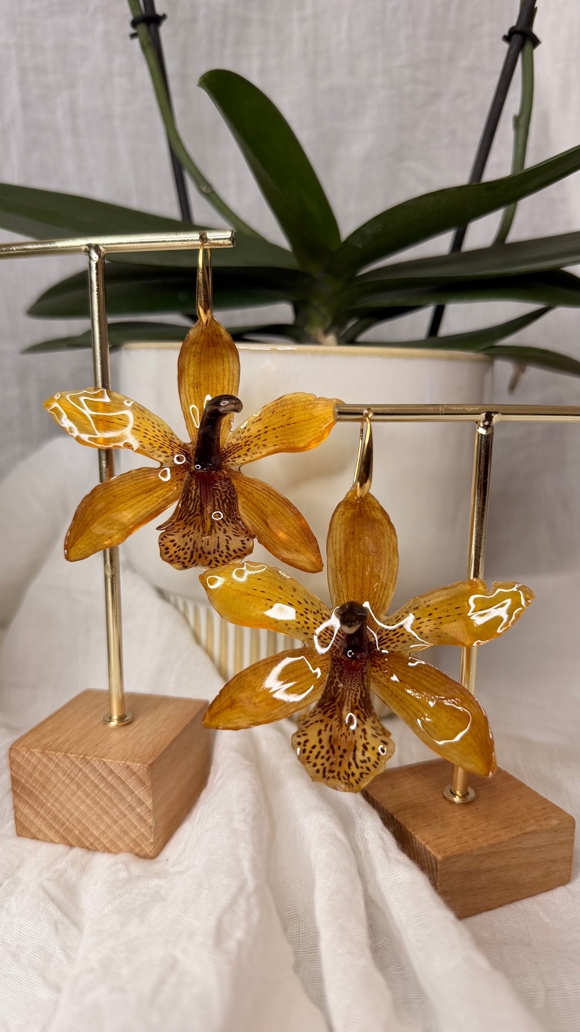 Bijoux réalisé entièrement a la main avec des fleurs d’orchidées Cymbidium. Un processus de fabrication spéciale est utilisé pour conserver la fleur dans la résine.