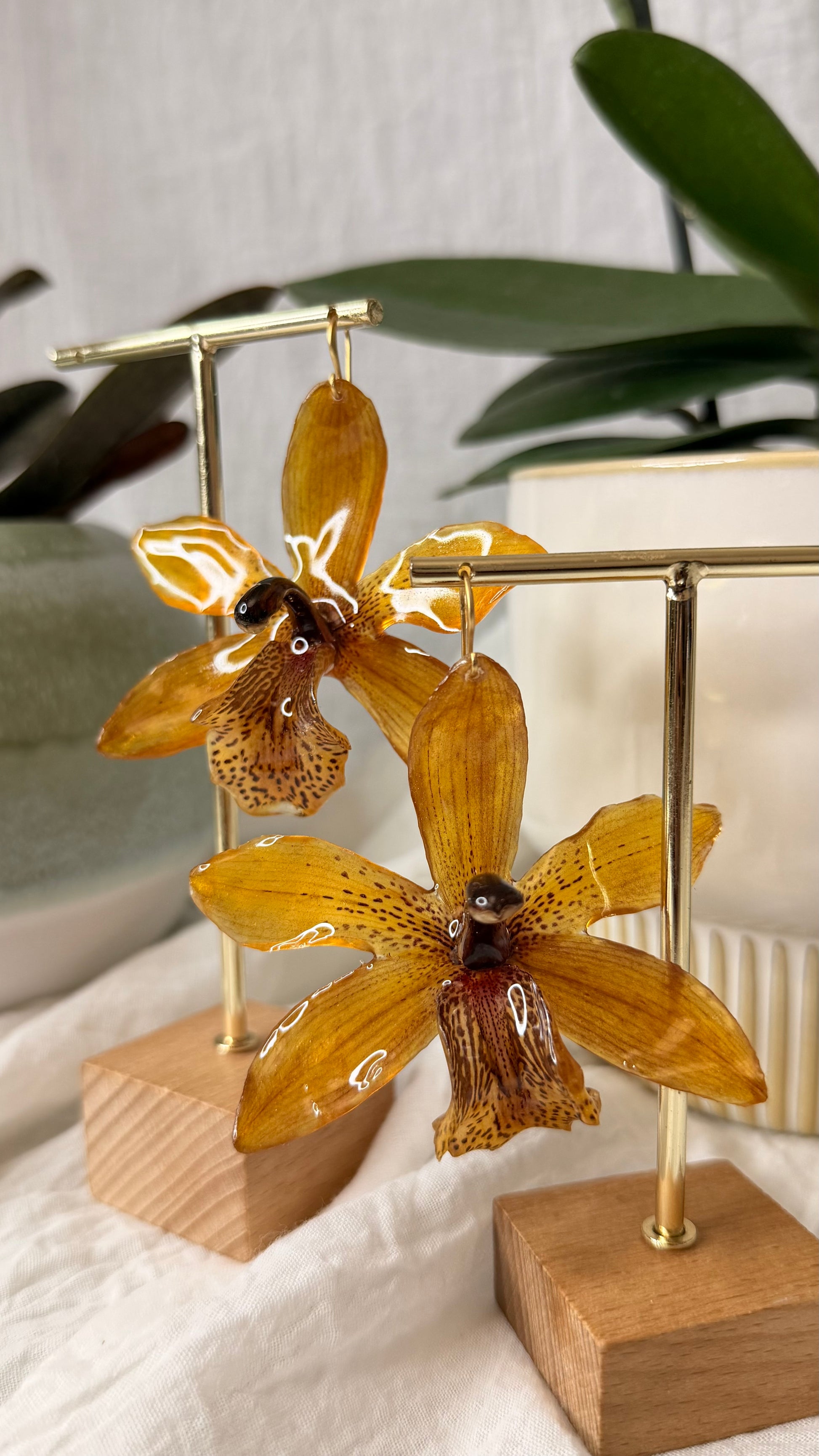Bijoux réalisé entièrement a la main avec des fleurs d’orchidées Cymbidium. Un processus de fabrication spéciale est utilisé pour conserver la fleur dans la résine.