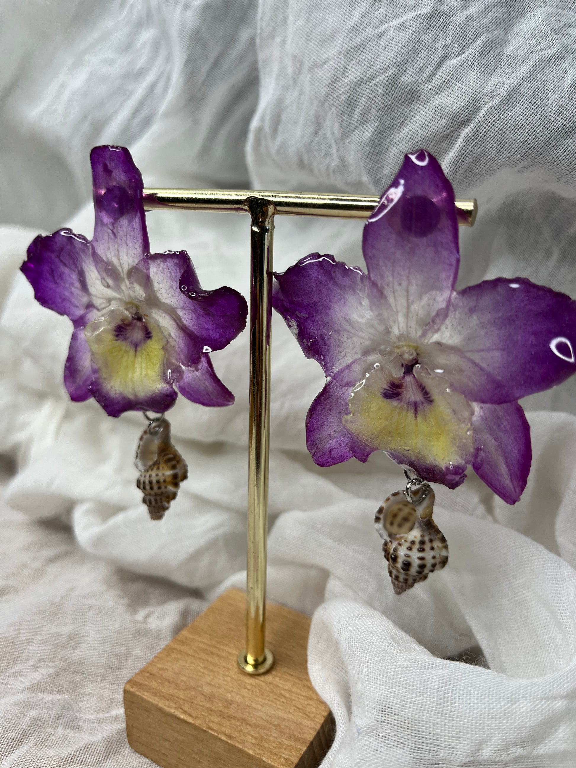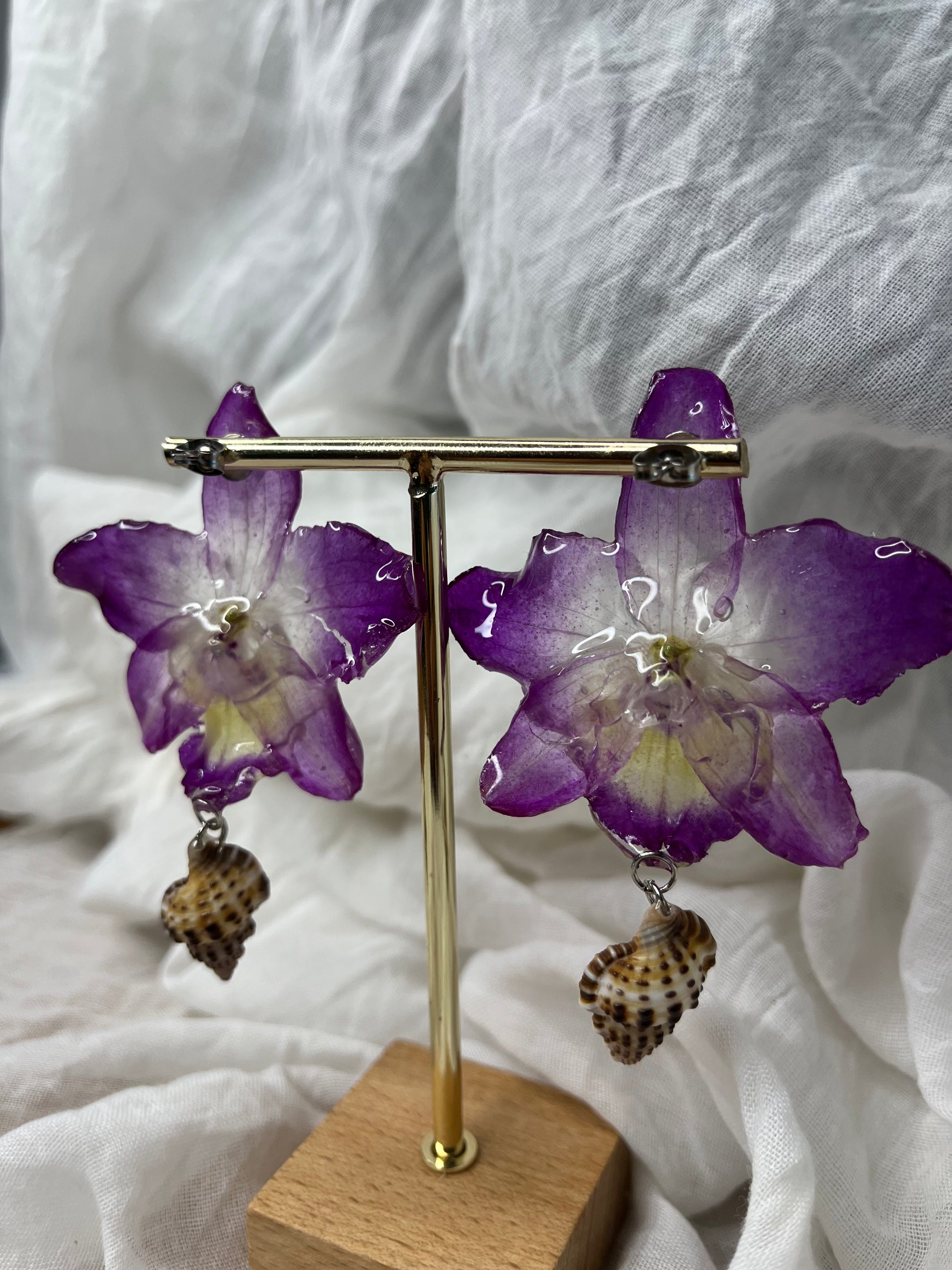 Boucle faite main avec deux vrai orchidées séchées conservées dans la résine et deux vrai coquillages