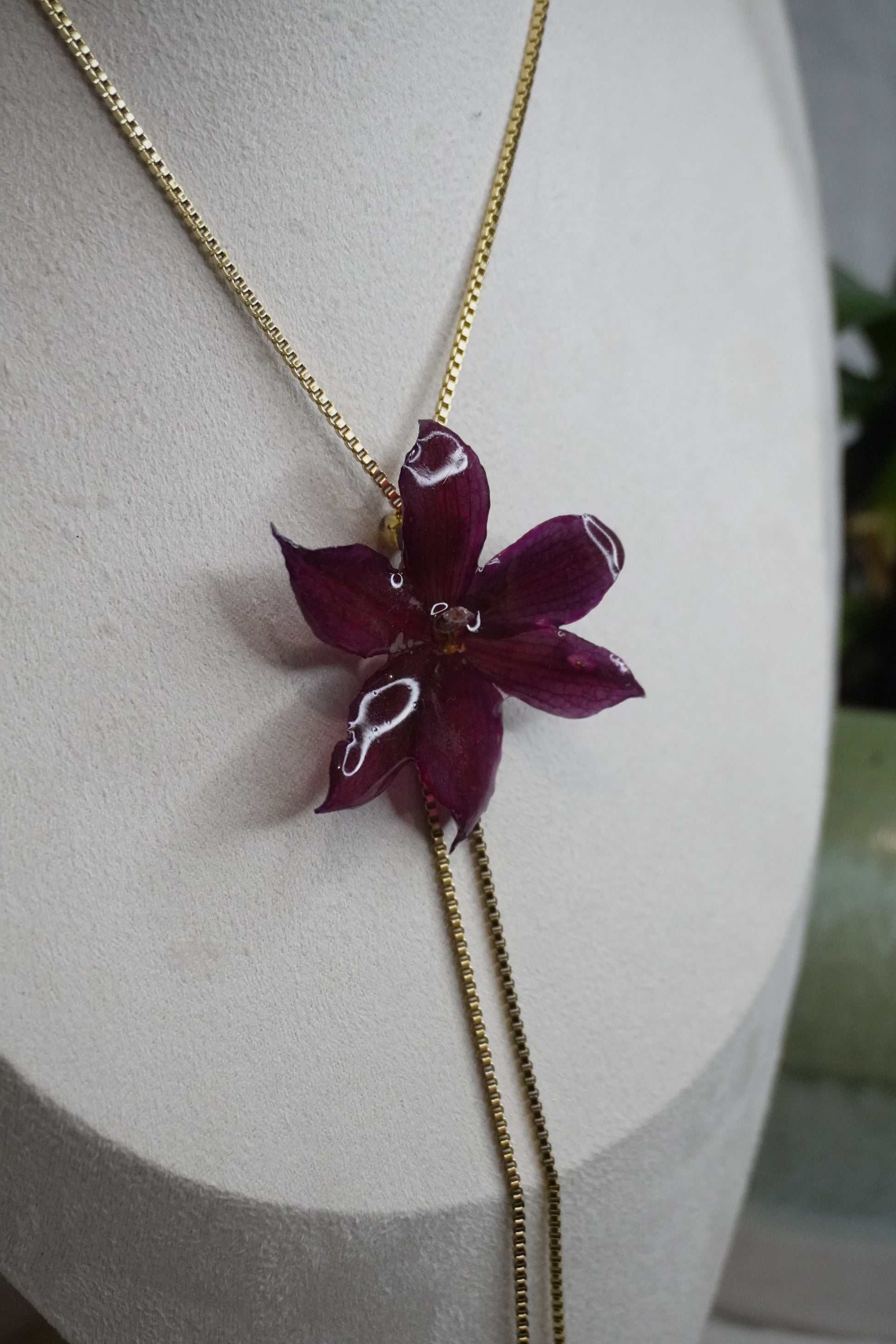 Ce bijou délicat est entièrement fait main, mettant en valeur de véritables fleurs séchées soigneusement conservées dans de la résine. Chaque création est unique : les fleurs, par leur forme et leurs nuances naturelles, rendent chaque bijou absolument singulier.