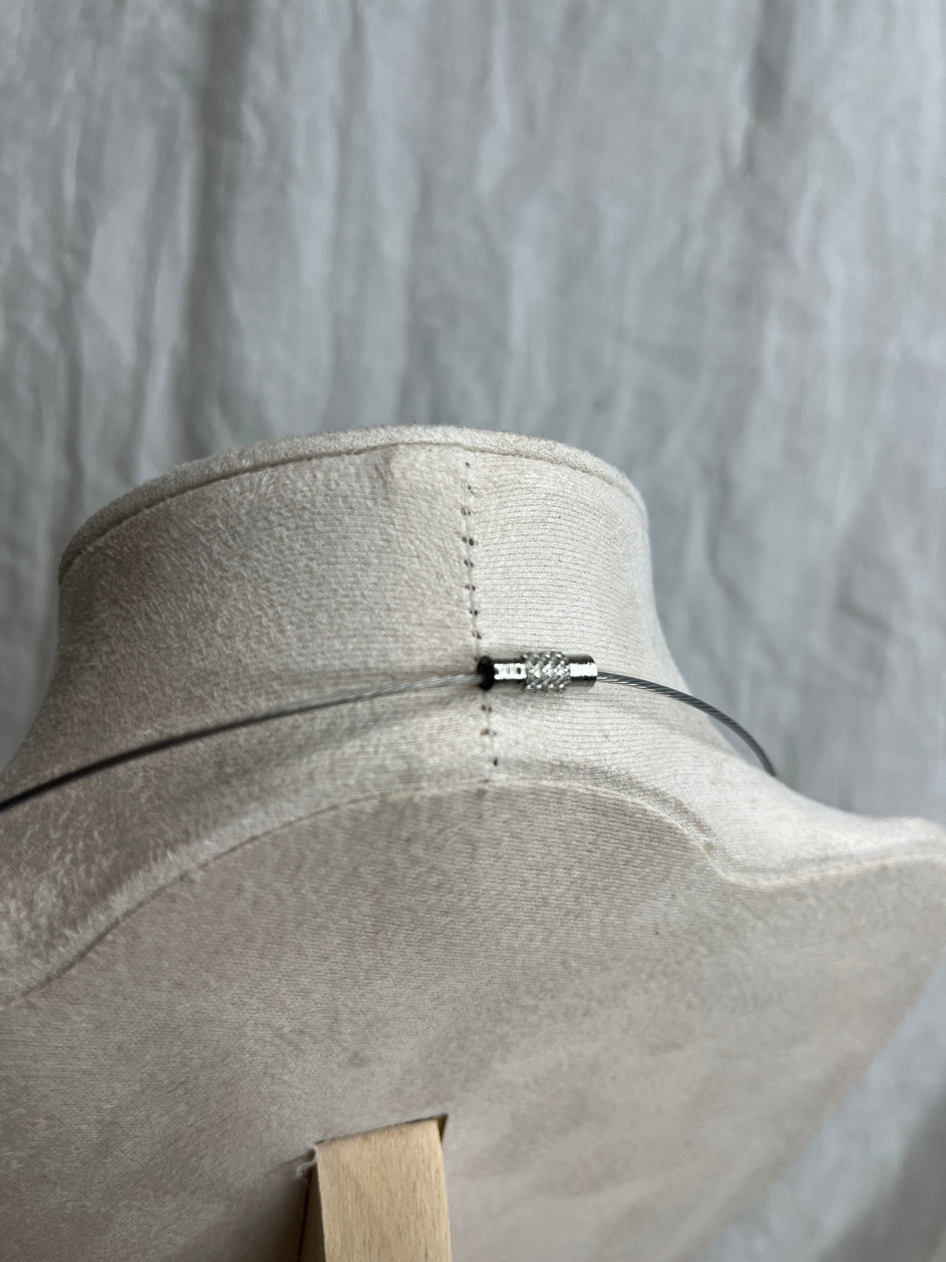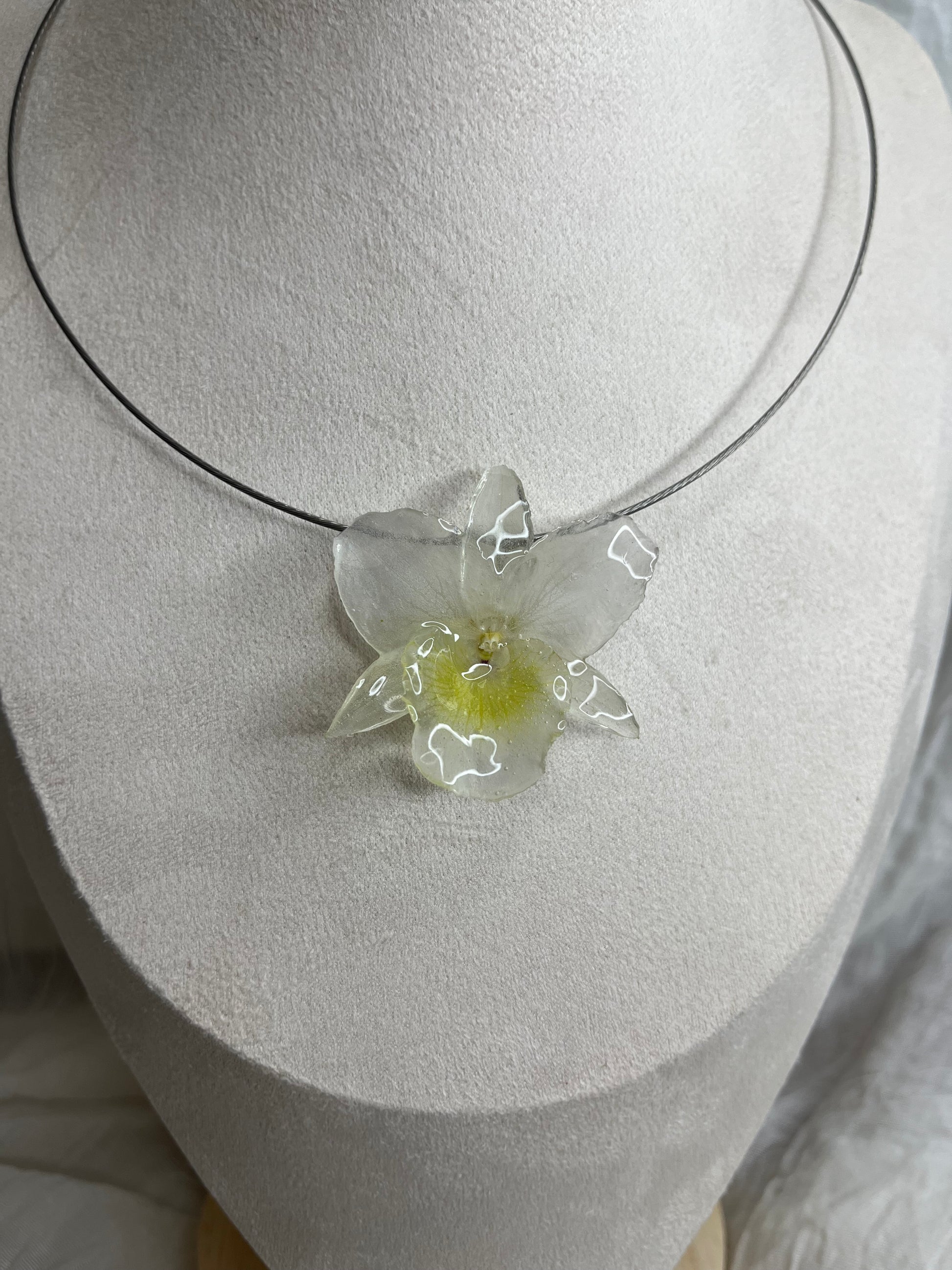 Collier fait main avec vrai fleur sécher blanche devenue translucide avec la résine